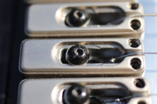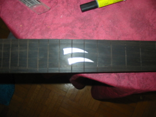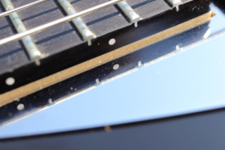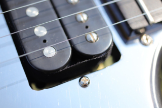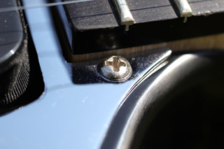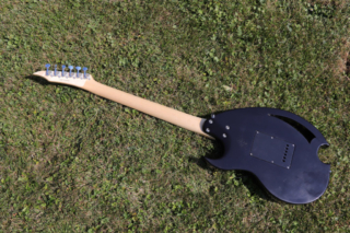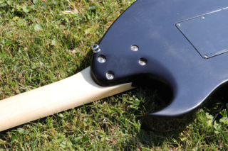 Die Restaurierung umfasst die Erneuerung der Stehbolzenlöcher, indem ein Stück Ahorn passgenau eingesetzt wurde. Auch weitere Schadstellen wurden ausgebessert. Dann wurden Hals und Korpus mit PU-Lack lackiert. Beim Neubau kommen Gotoh Mechaniken und GFS Pickups zum Einsatz.